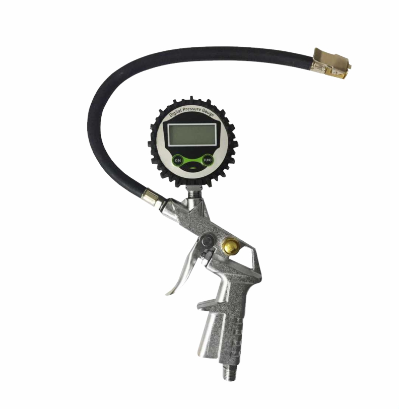 Em alumínio, com bico simples e visor em LCD, mede a pressão do pneu em Bar, kPa, kgf, e PSI.