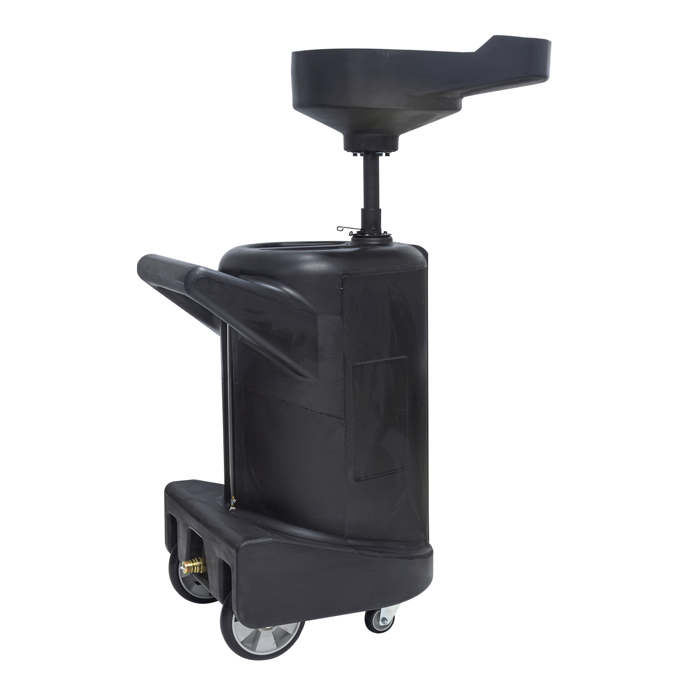 Nas especificações, o fabricante informa altura máxima de 1.980 mm, dimensões do carrinho de 903 x 580 x 530 mm e dimensões do captador de 235 x 620 x 550 mm. O visor de nível embutido facilita a verificação do volume coletado, enquanto o captador com filtro e a válvula para drenagem reforçam a funcionalidade do equipamento para uso diário em operações de troca de óleo.