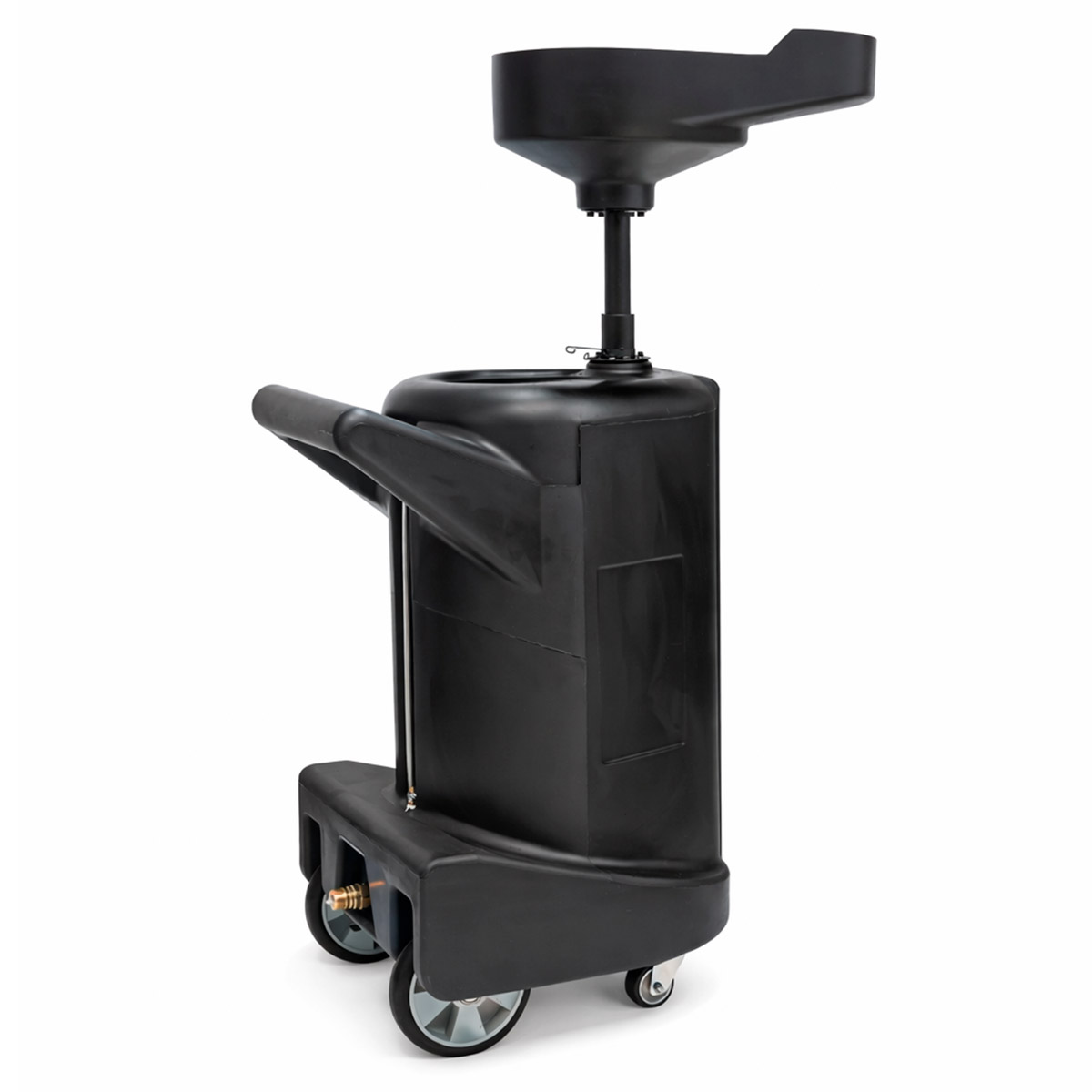 O coletor desloca-se pelo piso da oficina sobre carrinho próprio. O captador com filtro retém partículas sólidas durante a coleta, e o visor de nível embutido permite verificação imediata do volume acumulado sem necessidade de abertura do tanque.