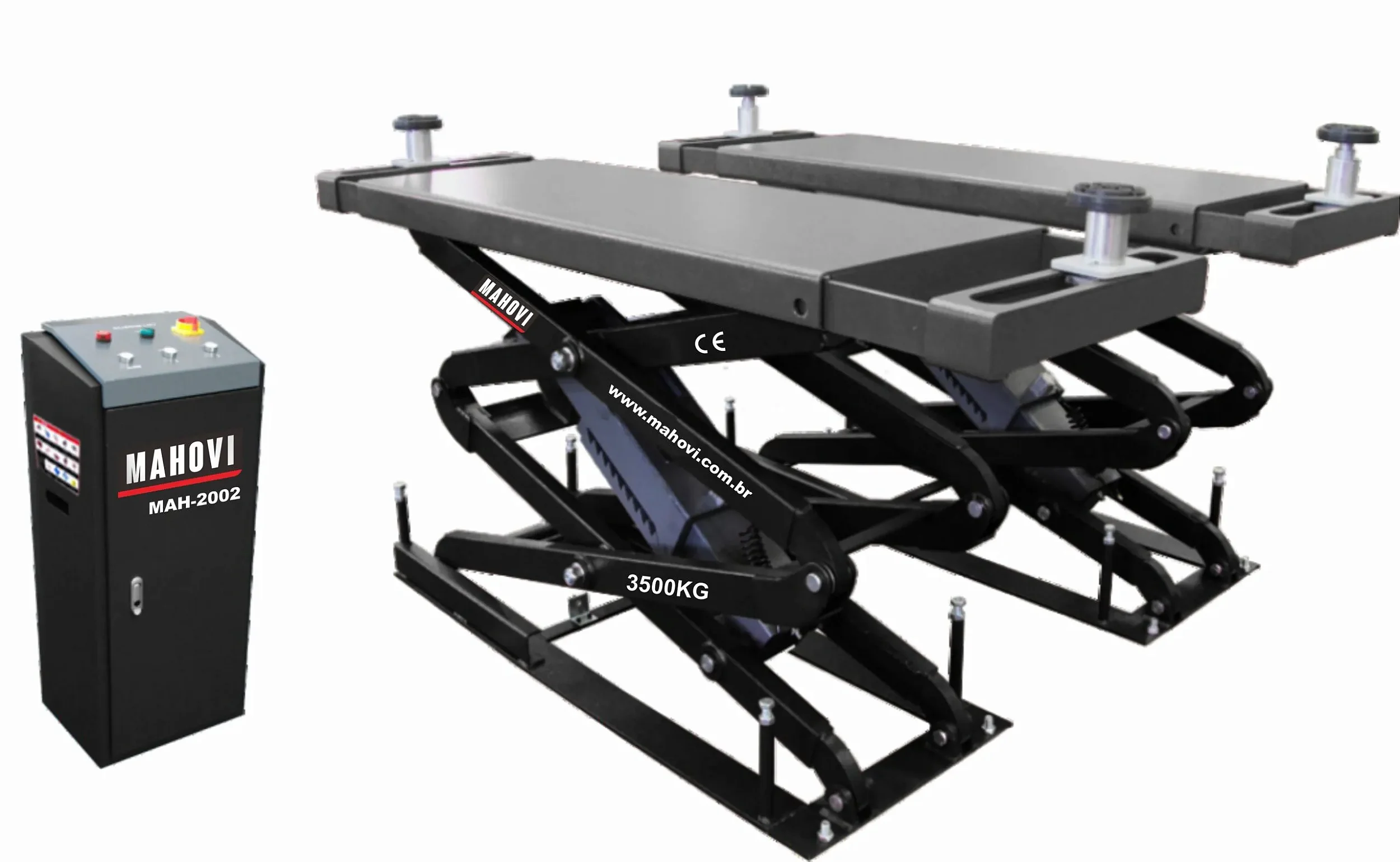 Desenvolvido para economizar espaço em sua oficina, mantendo sua produtividade, qualidade e segurança, o Elevador Automotivo Pantográfico Tesoura Embutido 3.5 Toneladas MAH-2002 atende veículos de até 3.500 Kg. Além disso, o elevador possui travas de segurança pneumáticas de dupla face acionadas automaticamente, sistema de cilindros hidráulicos sincronizados, aquele que utiliza a força da expansão do óleo no interior dos cilindros para mover as hastes dos pistões que irão realizar o movimento de elevação, parada descendente de segurança e alarme, válvula de segurança, sensor de limite de altura.