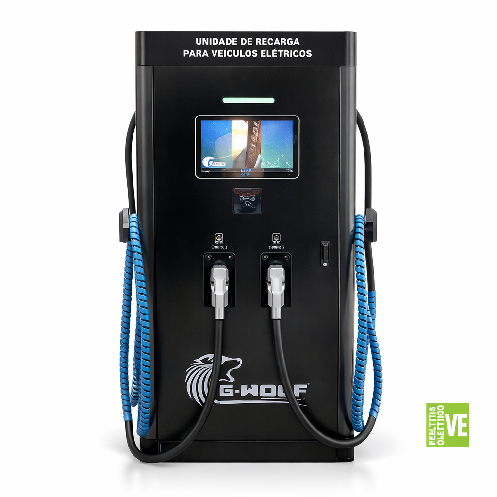 Um dos grandes diferenciais deste modelo é a presença de 2 conectores CCS Tipo 2 / 60 kW, permitindo atender aplicações de maior demanda e ampliar a capacidade operacional em ambientes comerciais. A E-Wolf também destaca a função de balanceamento de carga, que possibilita o carregamento simultâneo de dois veículos, otimizando o tempo e melhorando a eficiência energética do sistema.