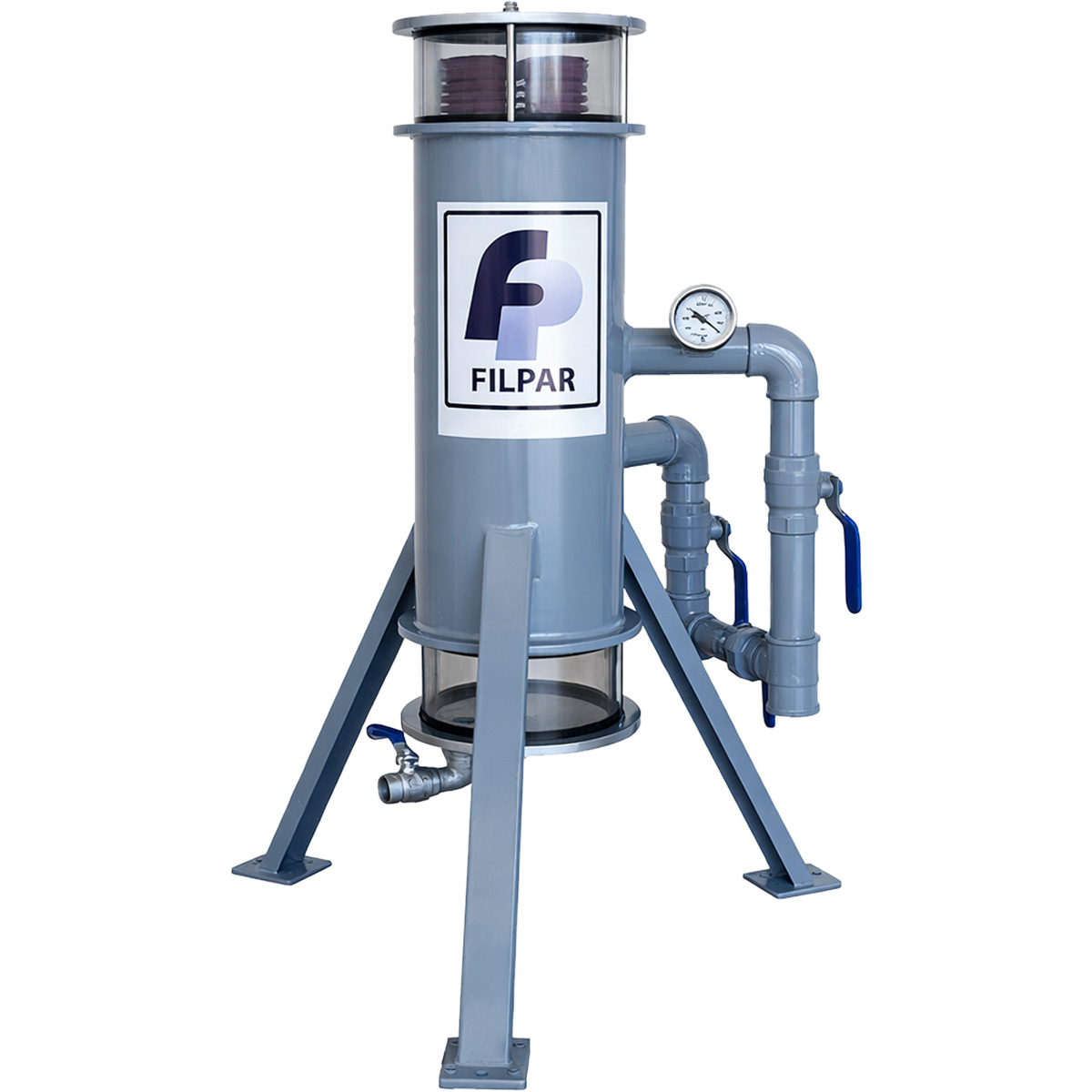 Equipado com quatro elementos filtrantes de celulose, retém partículas a partir de 5 micra e possui sistema "by-pass" para desvio momentâneo de fluxo. Inclui visores de policarbonato para monitoramento do fluído, vacuômetro que indica saturação dos elementos, dreno inferior e conexões de entrada e saída de 1½". Com dimensões de 95 cm de altura por 56 cm de largura, sua manutenção limita-se à troca periódica dos elementos filtrantes. A garantia é de dois anos.